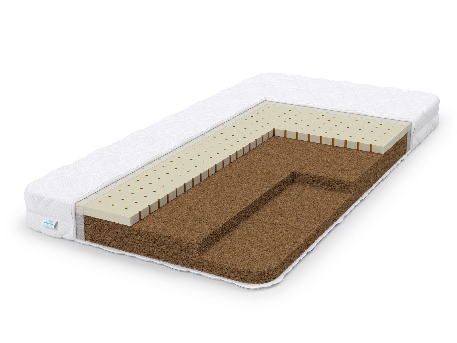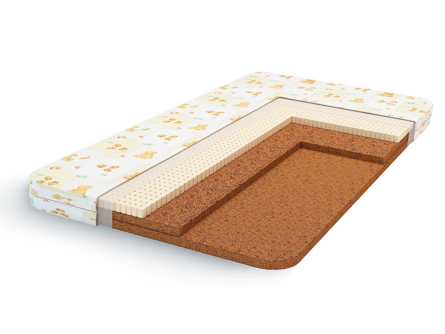 Двусторонний ортопедический матрас с разной жесткостью сторон. Одна сторона модели высокой жесткости, благодаря использованию латексированной кокосовой койры. Это природный материал, обладающий высокой упругостью и придающий матрасу отличный ортопедический эффект. Кокосовая койра отлично вентилируется, что позволяет говорить о ней, как о «дышащем» материале. К тому же, она не впитывает запахи, «не боится» влаги и не гниет. Другая сторона матраса имеет среднюю жесткость, за счет добавления латекса — это натуральный мягкий материал, изготавливаемый из млечного сока каучуконосных растений. Основная задача латекса — поддерживать прямое положение позвоночника малыша, предотвращая возможное искривление. Натуральный латекс обладает гипоаллергенными и антибактериальными свойствами. Такой матрас подойдет детям от 5 до 12 лет.