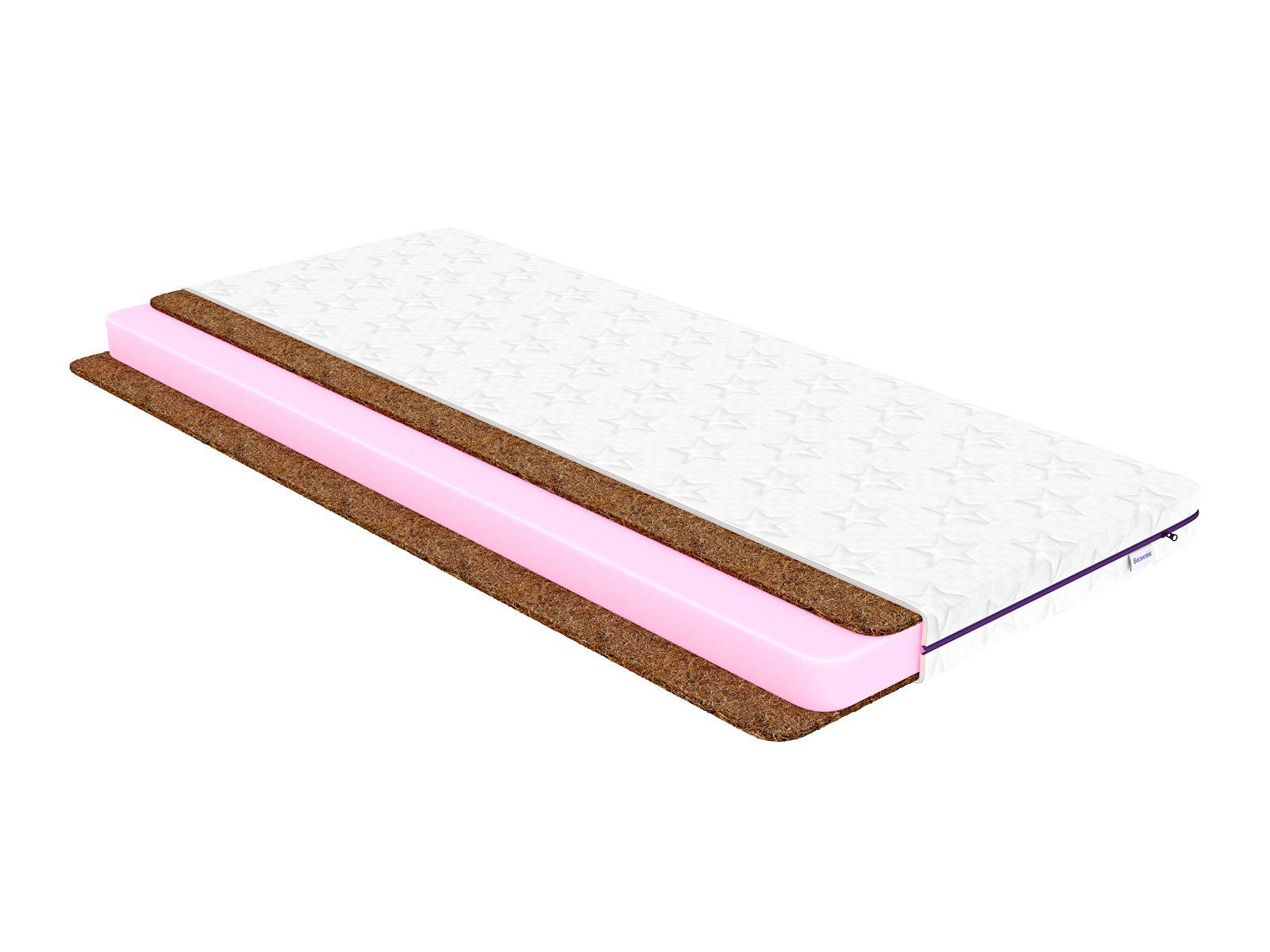 В центре модели установлен блок плотного ППУ. Упругая пена отвечает за распределение нагрузки и подстройку под контуры тела ребёнка. Пена хорошо гасит колебания, поэтому матрас не будет идти волнами или раскачиваться, даже если ребёнок активно двигается во сне. У поверхностей матраса симметрично установлены полотна койры кокоса. Это жёсткий и при этом натуральный слой, который знаменит своими ортопедическими свойствами. Койра подстраивается под изгибы спины и удерживает позвоночник в правильном положении. Койра кокоса изготавливается из растительных волокон, поэтому по своей природе свободно пропускает воздух. В состав кокоса входит естественные антибактериальные вещества.