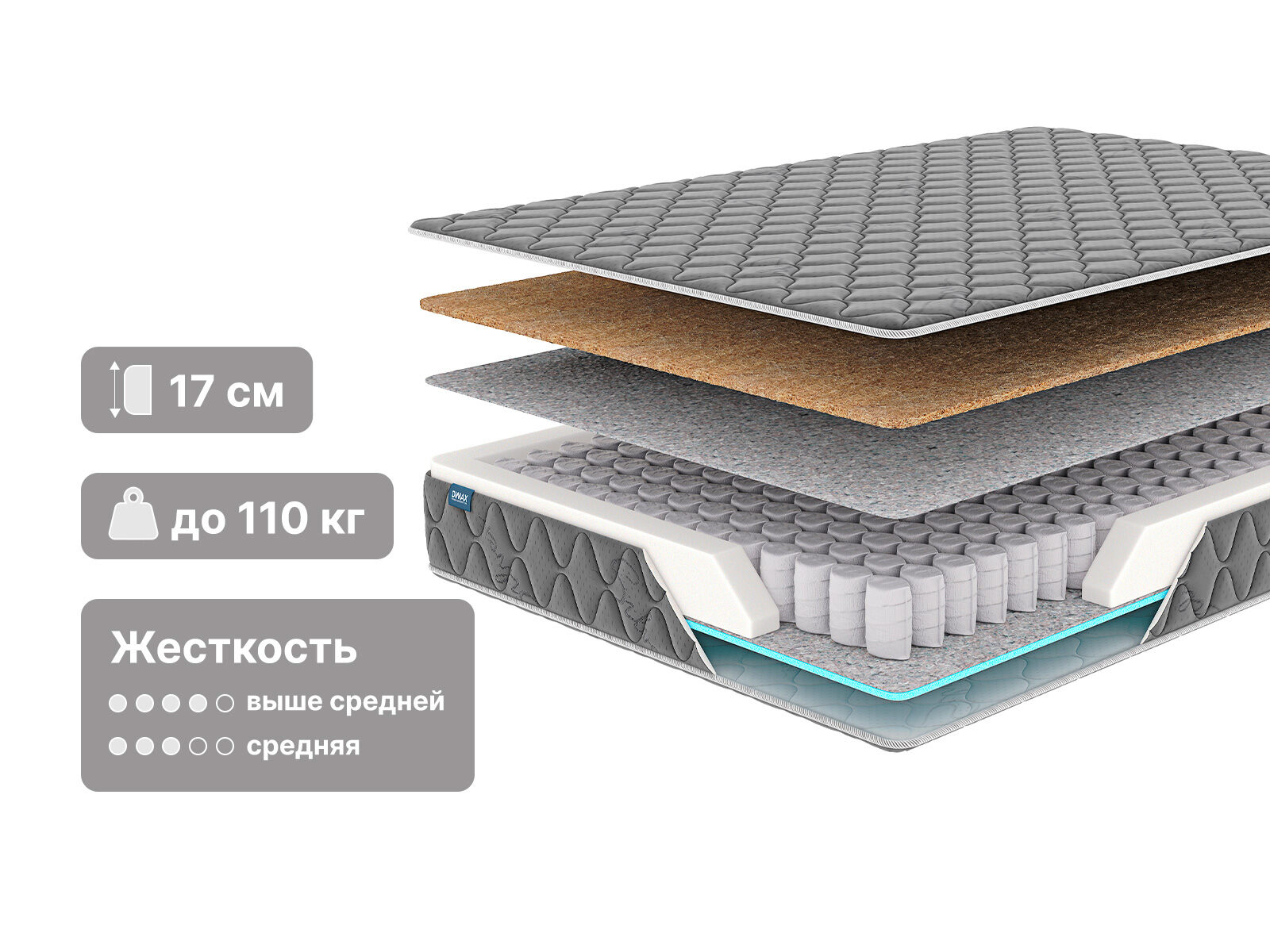 Сторона с уровнем жёсткости выше среднего проложена натуральной койрой кокоса. Материал даёт усиленную поддержку спине и телу.