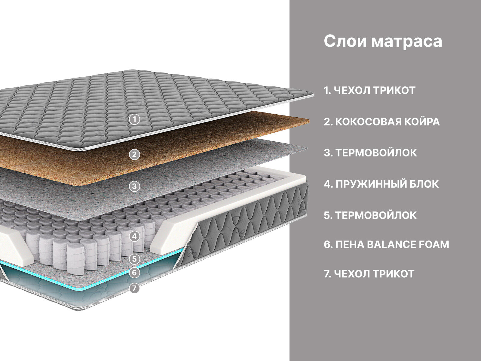 Сторона со средней жёсткостью проложена пеной Balance foam. Наполнитель подстраивается под фигуру и обеспечивает комфортный и здоровый сон.