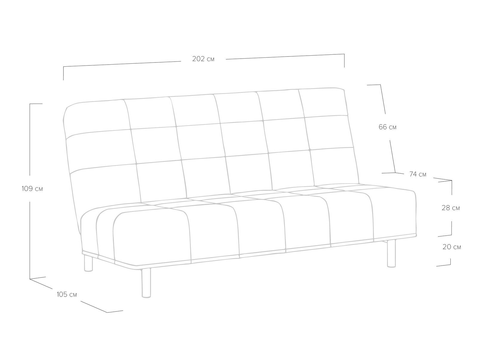 Диван для сна и отдыха в современном стиле с механизмом трансформации «клик-кляк». Основа дивана - металлическое основание с ламелями и анатомическим матрасом с независимым пружинным блоком. Благодаря съемному чехлу с объемной стежкой в форме квадратов, диван органично впишется в современные интерьеры в стиле минимализм. Благодаря отсутствию подлокотников у дивана минимальные габариты как в сложенном, так и разложенном виде.