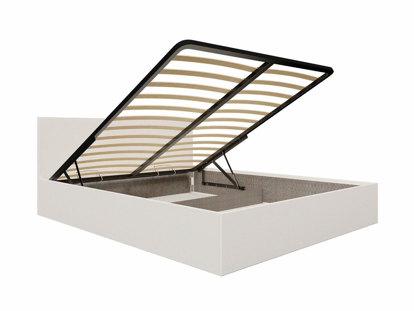 Кровать комплектуется металлическим основанием с подъемным механизмом, под которым находится вместительный бельевой ящик для хранения сезонных вещей и постельных принадлежностей.