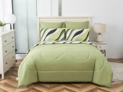 В комплект входит легкое, мягкое, летнее одеяло. Его можно стирать вместе с другим бельем, оно быстро сохнет и после стирки его не нужно гладить.