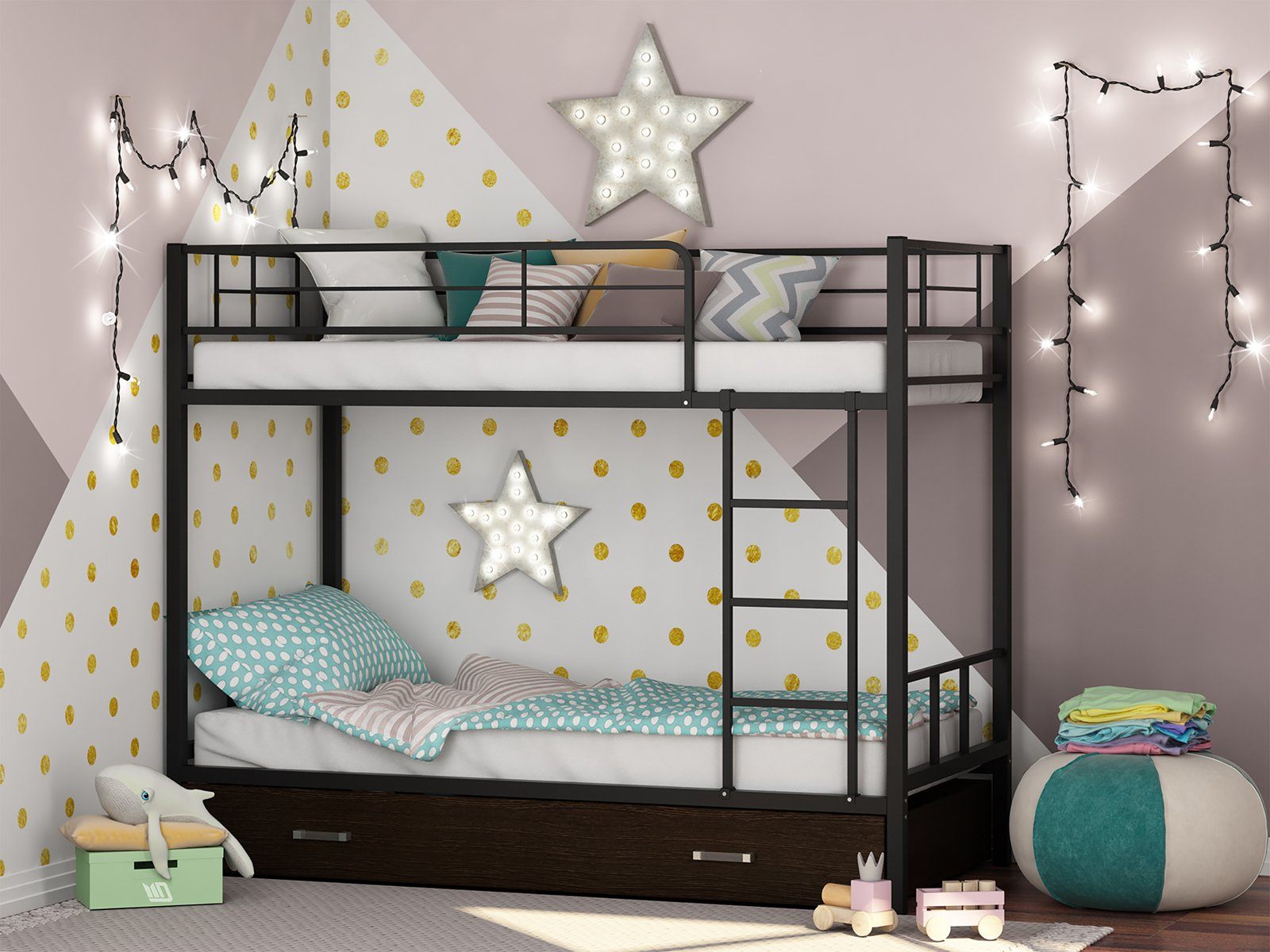 Все металлические элементы кровати покрыты износоустойчивой краской без запаха. Двухъярусную кровать можно собирать и разбирать неограниченное количество раз, и от этого она не потеряет в прочности и качестве.