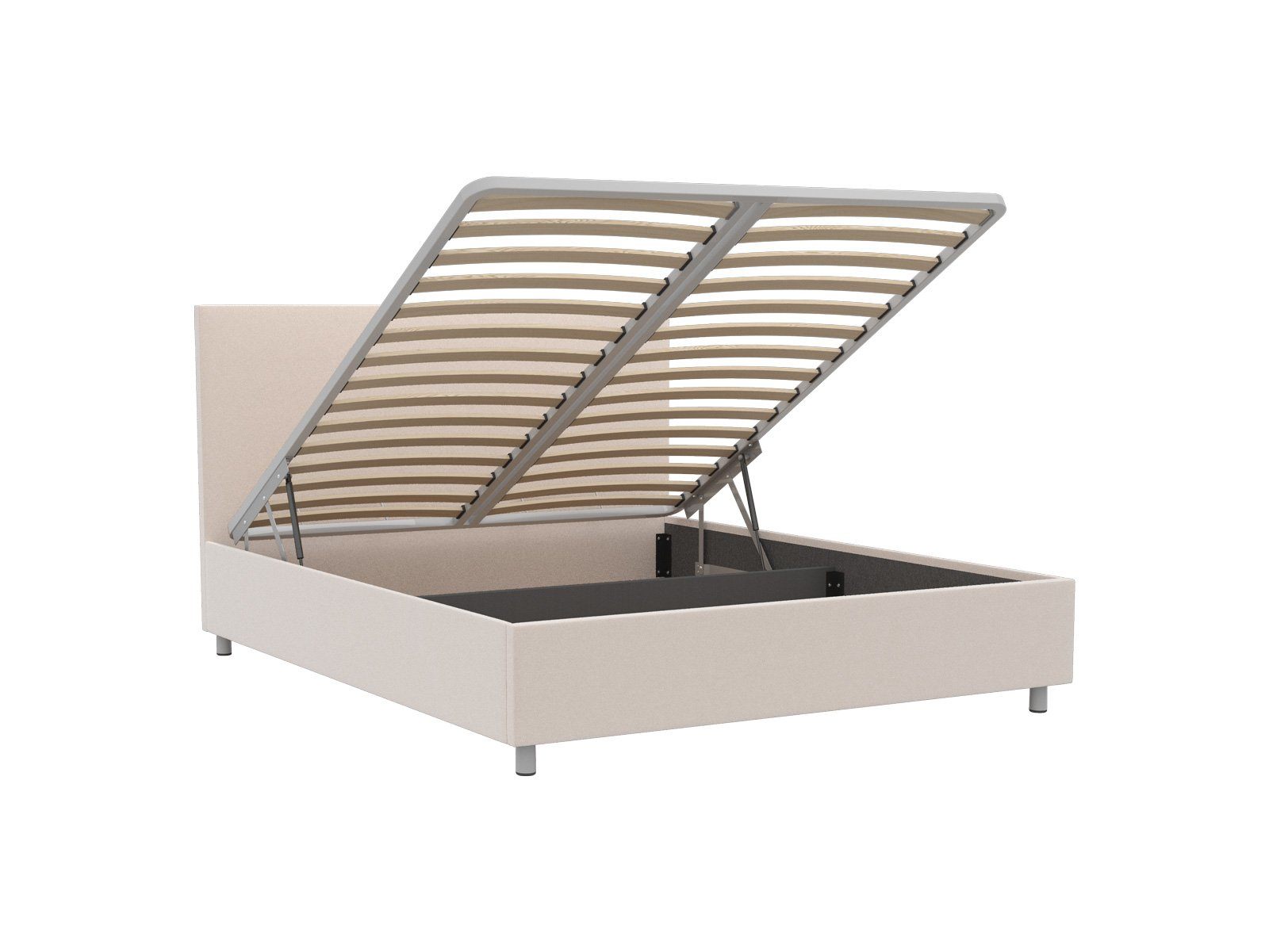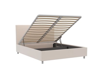 Кровать оснащена подъемным основанием с ламелями, под которым находится вместительный ящик для хранения. Рекомендуемая высота матраса от 13 см, вес матраса до 50 кг.