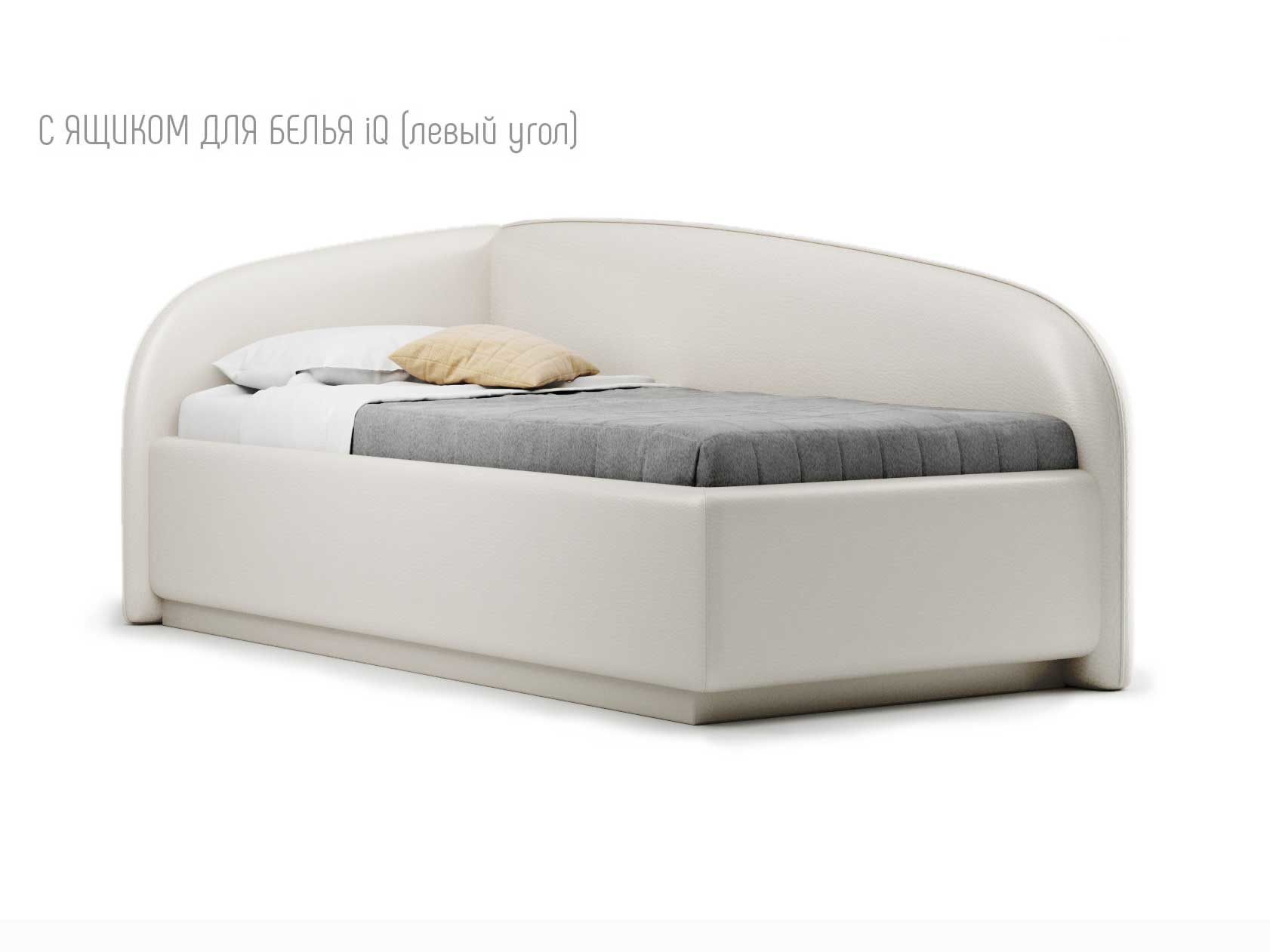 Кровать укомплектована IQ с подъемным механизмом и ящиком для белья без дна (дополнительная платная опция - дно к ящику IQ из HDF (ХДФ). Каркас кровати на цоколе, декоративный чехол на цоколе съёмный. Глубина ящика для белья - 30 см, без ограничения нагрузки на ящик.
