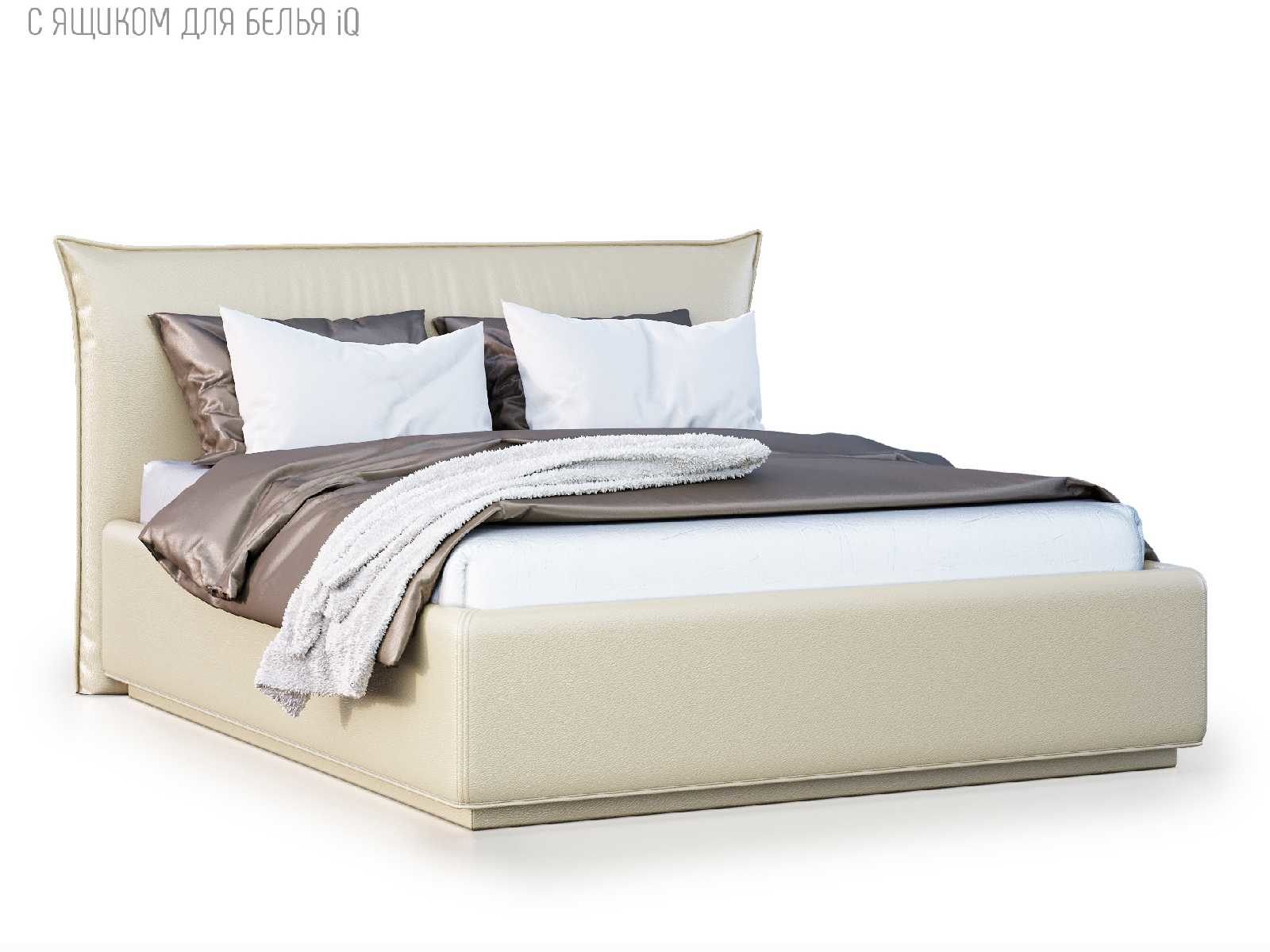 Кровать укомплектована IQ с подъемным механизмом и ящиком для белья без дна (дополнительная платная опция - дно к ящику IQ из HDF (ХДФ). Каркас кровати на цоколе, декоративный чехол на цоколе съёмный. Глубина ящика для белья - 30 см, без ограничения нагрузки на ящик.