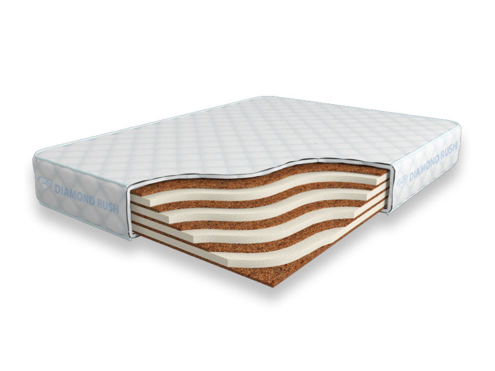 Матрас Diamond Rush Mono Mix Cocos 17 SD является беспружинным, т.е. не имеет в своей основе пружинного блока. В его состав входят одно или несколько чередований слоев латексированной кокосовой койры (1см) и искусственного латекса (3см). Такая модель матраса относиться к среднежестким и обладает средним ортопедическим эффектом.