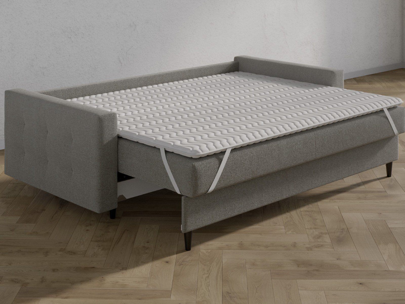 Топпер изготавливается из натуральной кокосовой койры. Этот материал обладает высокой жёсткостью, прочностью и долговечностью. Он подходит для выравнивания неровных поверхностей и обеспечивает дополнительную жёсткость. Крепление осуществляется с помощью резинок по четырём углам. Чехол выполнен из натурального хлопка.