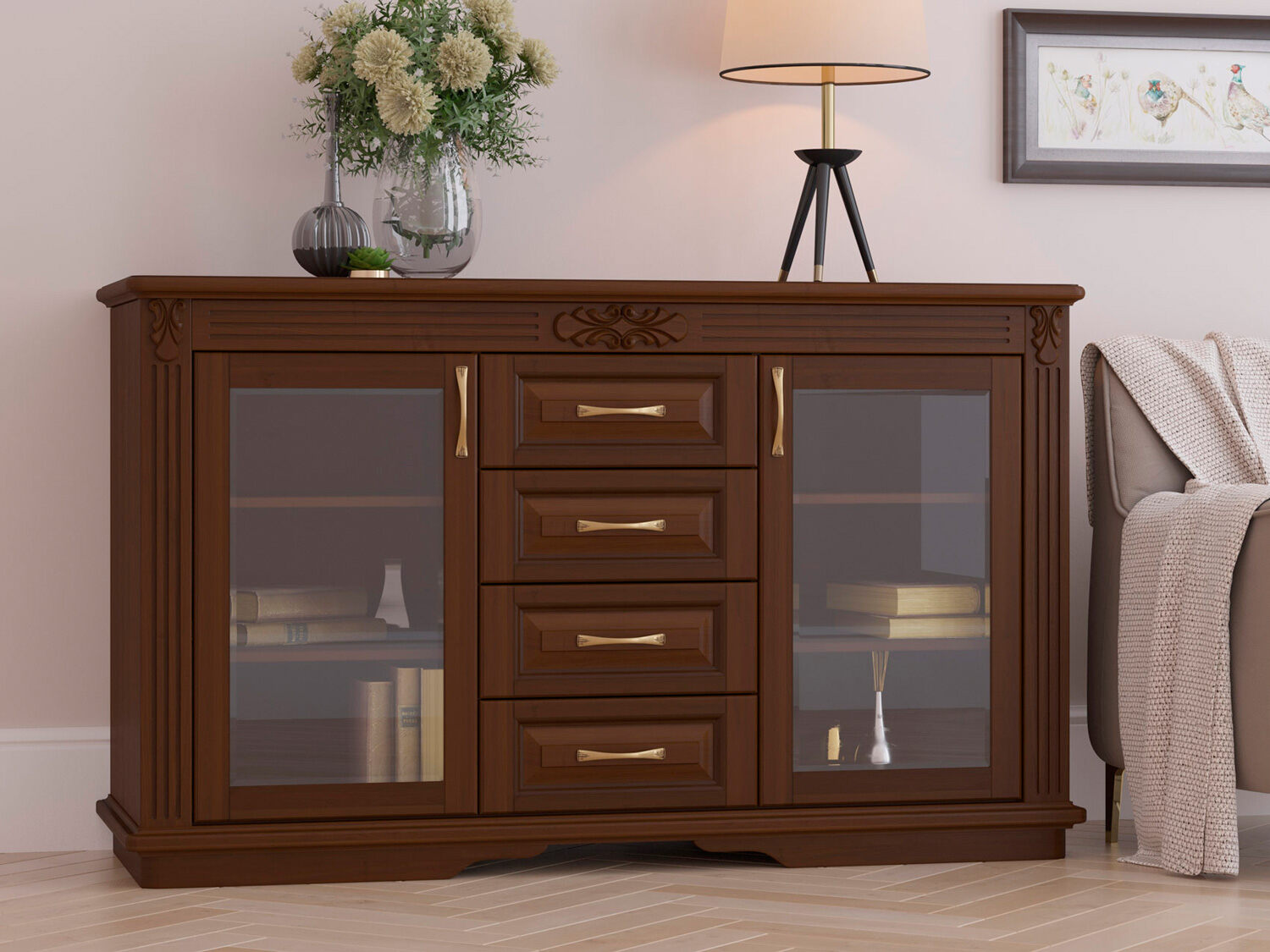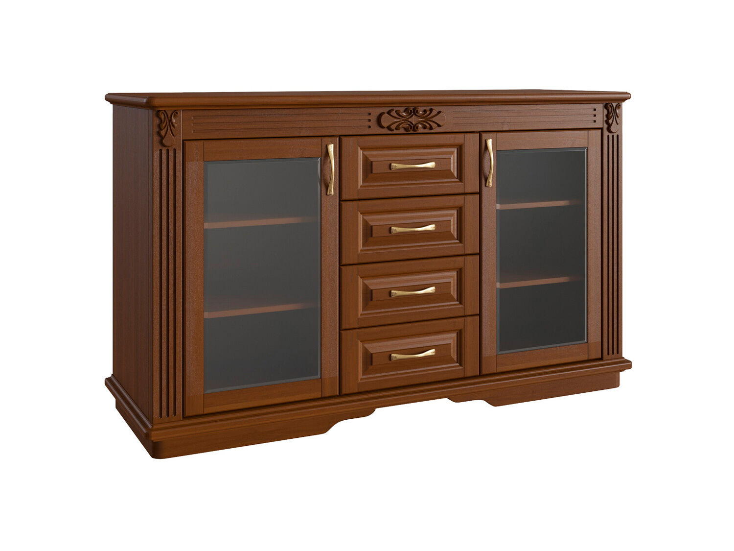 Комод Греденция Палермо на 4 ящика - это прообраз известных всем кабинета, серванта, комода и другой многофункциональной мебели. Эта мебель может быть изготовлена из массива бука или ясеня на Ваш выбор, в классическом стиле, идеально впишется в интерьер гостиной или кабинета, в ней удобно хранить, как небольшие предметы – для этого есть 4 выдвижных ящика, так и посуду – благодаря двум вместительным отсекам с полками за стеклянными дверцами.