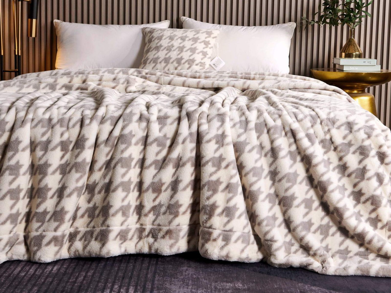 Sofi De Marko представляет вашему вниманию коллекцию Эрнесто, включающую в себя пледы и декоративные наволочки из искусственного меха с принтом «гусиная лапка».