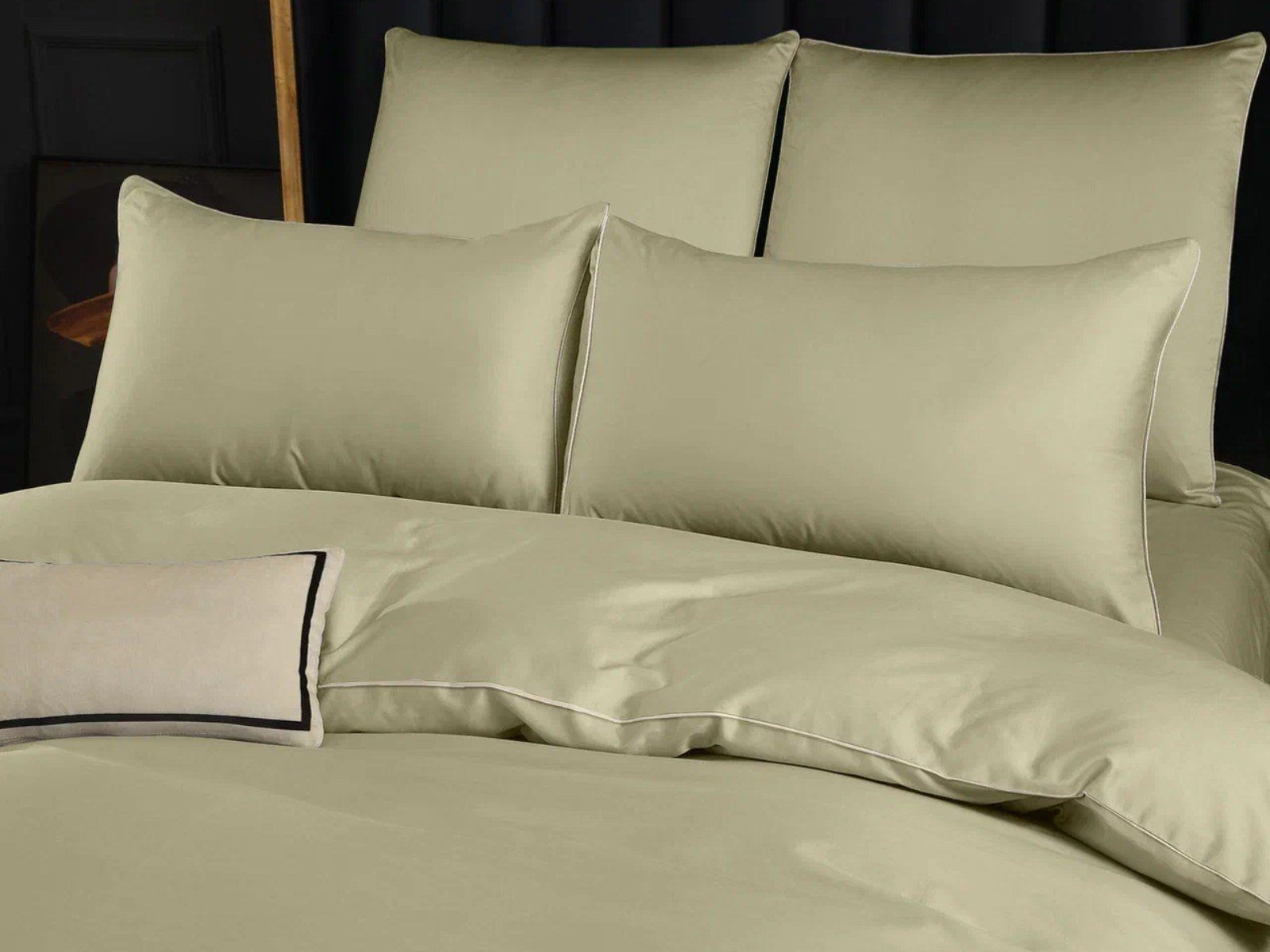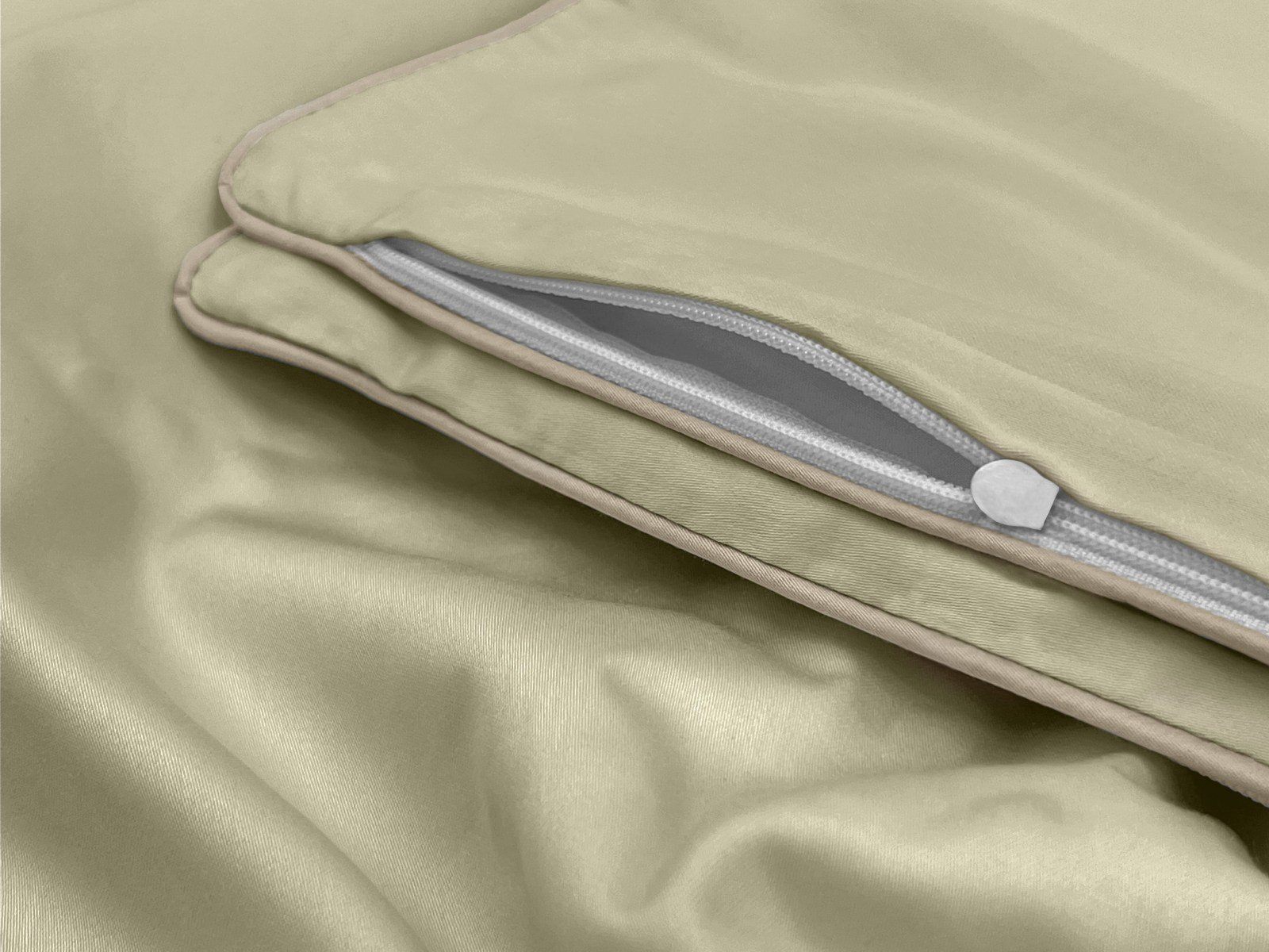 Пододеяльник украшен декоративным кантом по периметру и имеет удобную молнию по всей ширине, что значительно упрощает процесс его замены. Спокойный и деликатный светло-оливковый оттенок создаст атмосферу умиротворения и полного релакса в Вашей спальне.