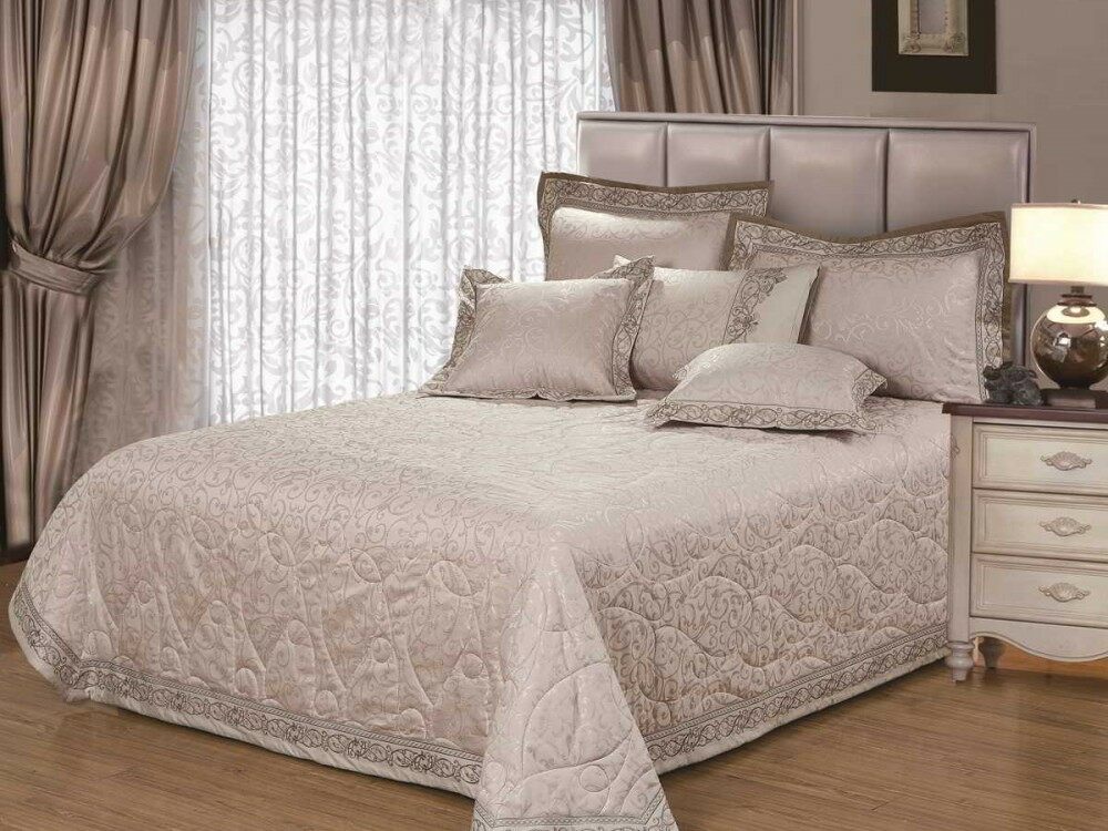 Тонкие завитки причудливо переплетаются между собой, образуя сплошной ажурный узор. Волокна сотканы таким образом, что возникает ощущение, будто рисунок подсвечен изнутри. Это покрывало можно назвать хамелеоном за уникальную способность менять цвет в зависимости от освещения: оно может быть и серебристо-серым и жемчужно-бежевым. Вышивка по канту делает это покрывало еще более богатым.