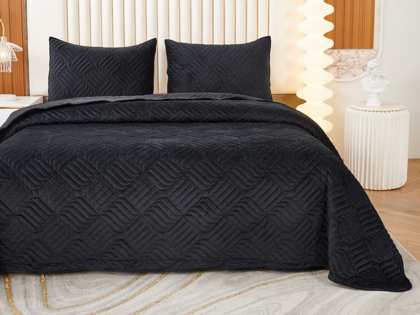 Покрывала выполнены в 10 оттенках: крем, мокко, пепельный, песочный, светло-бежевый, светло-серый, серый, темно-серый, чайная роза и черный. Стежка в виде геометрического орнамента подойдет к любому современному интерьеру. Из-за особого плетения, велюровая ткань покрывала отражает свет и красиво переливается при различном освещении.