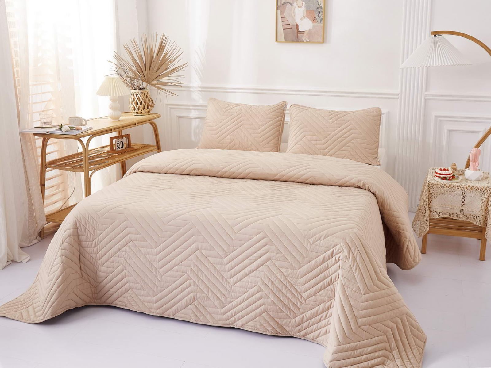 В комплект входят покрывало и одна либо две наволочки (50х70 см) из аналогичного материала в зависимости от размера. Изделия гипоаллергенны, они подходят детям и людям с чувствительной кожей. Покрывала и наволочки не линяют, сохраняют форму и цвет при многочисленных стирках и не выгорают на солнце. Изделия можно стирать в щадящем режиме при температуре не выше 30 градусов.